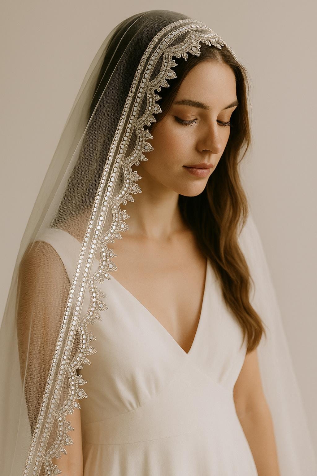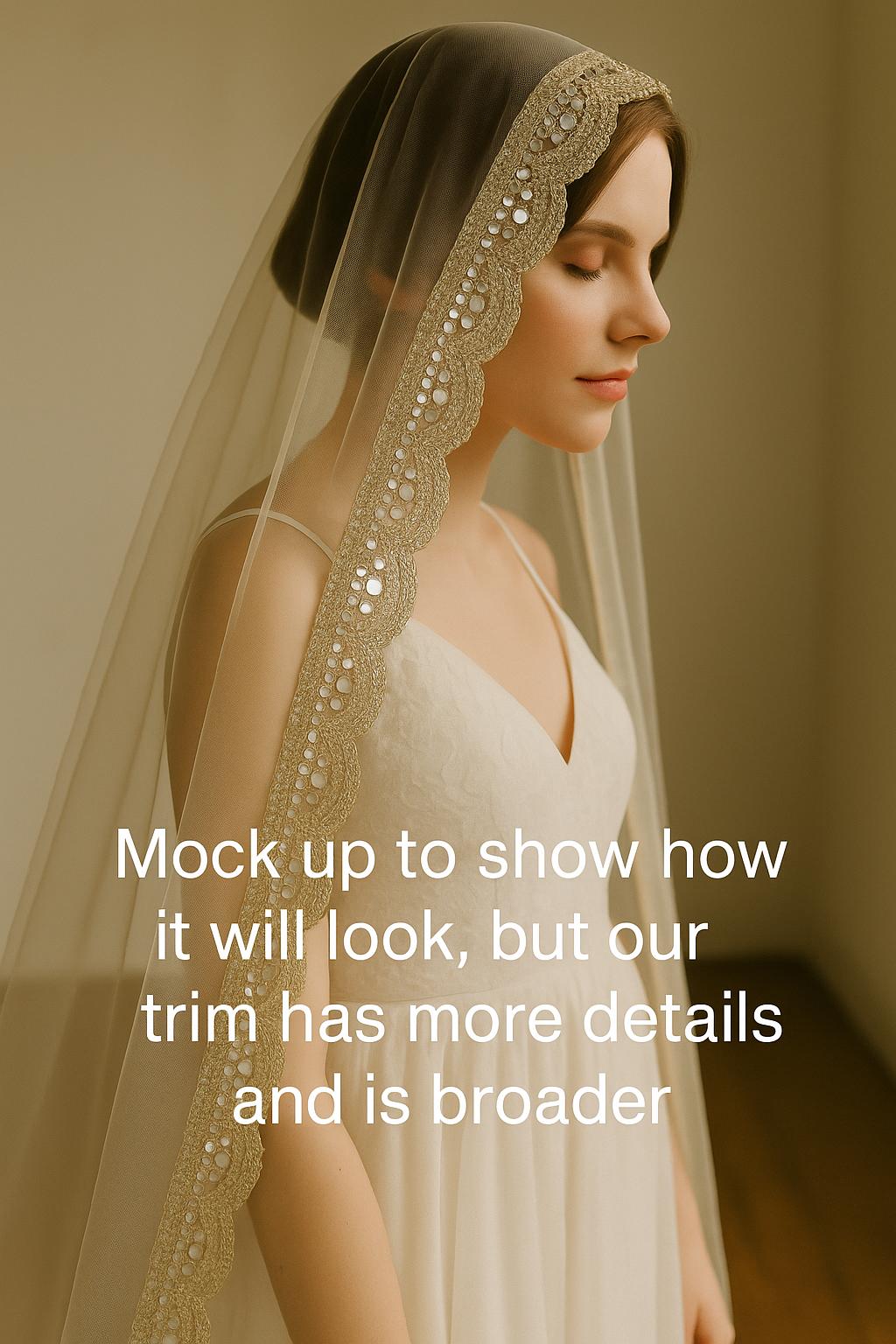 Bring brilliance and elegance to your creations with this crystal mirror and zircon sequin trim — a handcrafted masterpiece designed for bridal couture, ethnic wear, and luxury embellishment projects. This high-shine trim features intricately placed mirror discs, zircon stones, and silver sequins stitched over a sheer mesh base, perfect for enhancing sarees, bridal veils, lehenga borders, dupatta edges, and more. The reflective finish and fine detailing make it a favorite for designers, brides, and creators seeking to add a regal, radiant touch to their garments. ⸻ Product Details: • Material: Crystal mirrors, zircon stones, sequins on mesh • Color: light gold with high-shine reflection • Width: Approx. 9cm • Base: Transparent mesh/tulle for easy stitching • Sold By: 1 yard to 9 yards and 1 roll is of 9 yards complete a full saree border ⸻ Ideal For: Bridal lehengas, saree borders, dupattas, veils, blouses, belts, potli bags, and wedding couture projects.