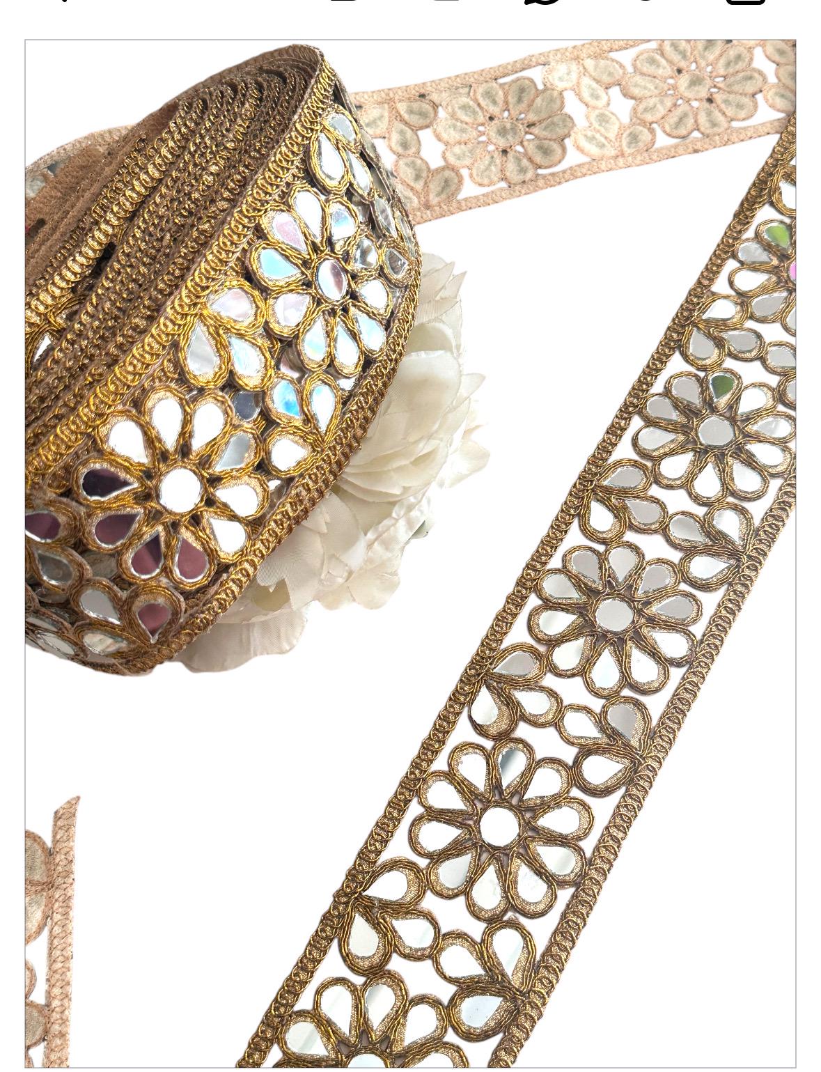 Transform your clothing with the Antique Gold Mirror Trim Waist Belt, an elegant addition to your DIY sewing projects. Inspired by traditional Indian craftsmanship, this trim features a stunning flower pattern with reflective gold mirror embellishments. Perfect for creating a Bollywood-style dress belt, adding a decorative saree border, or even crafting a unique waist belt, this trim brings a touch of luxury and sparkle to any garment.