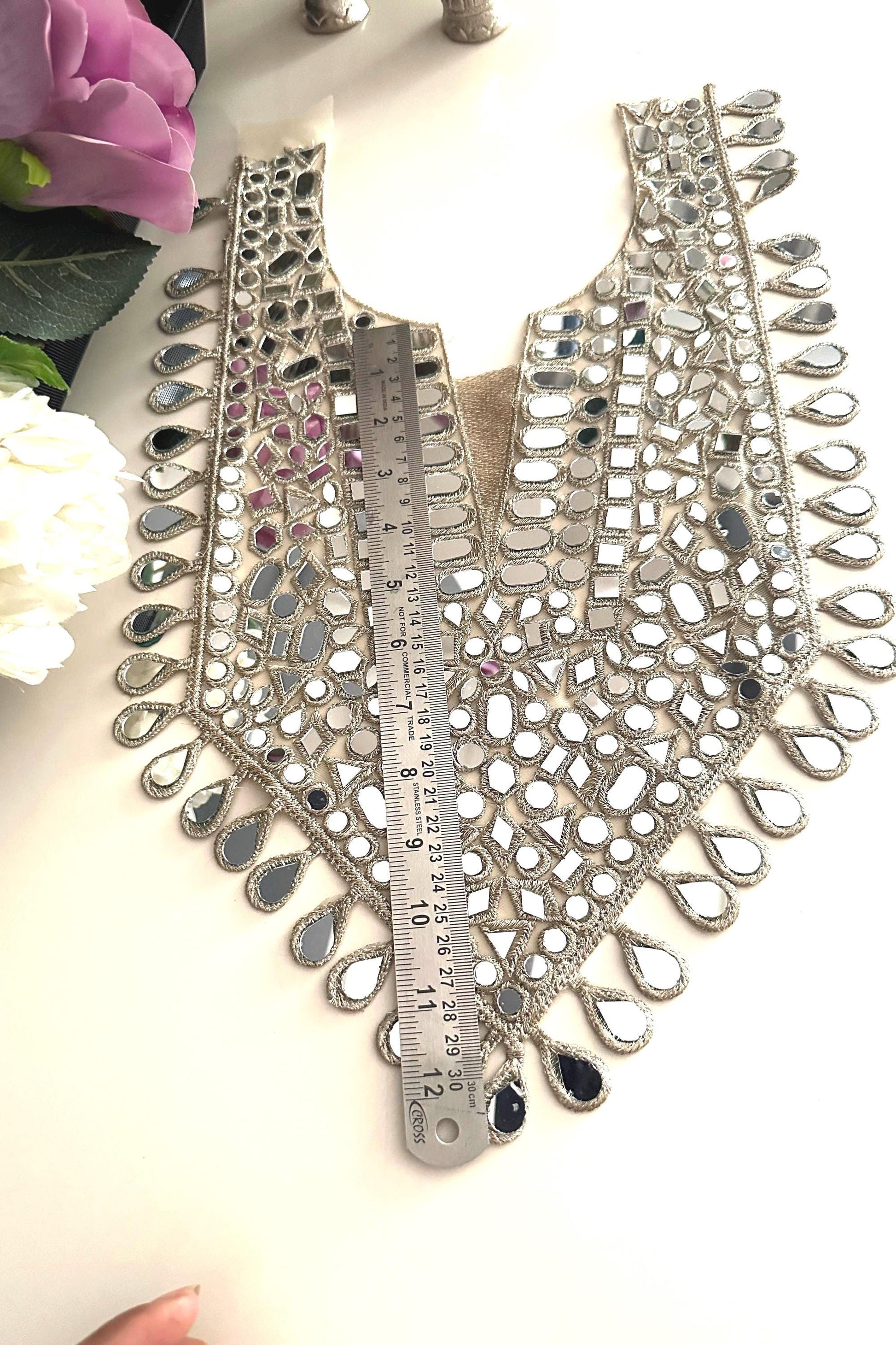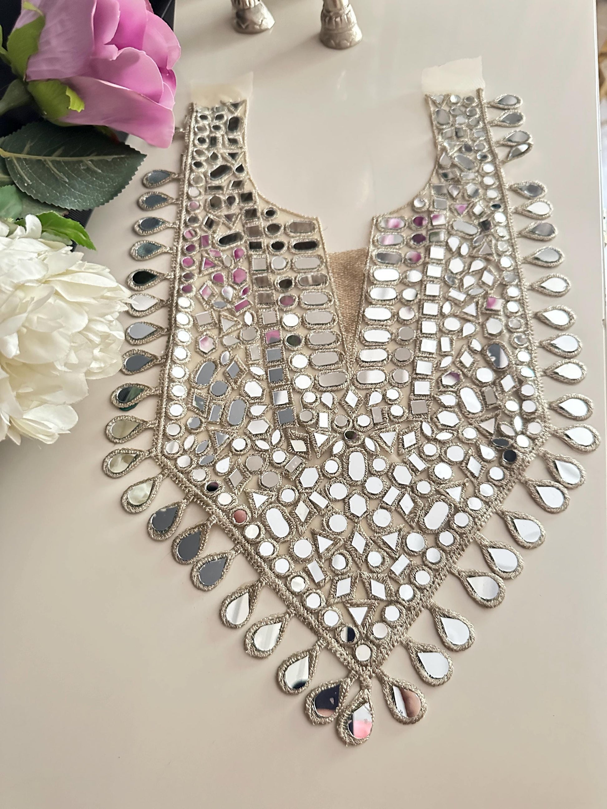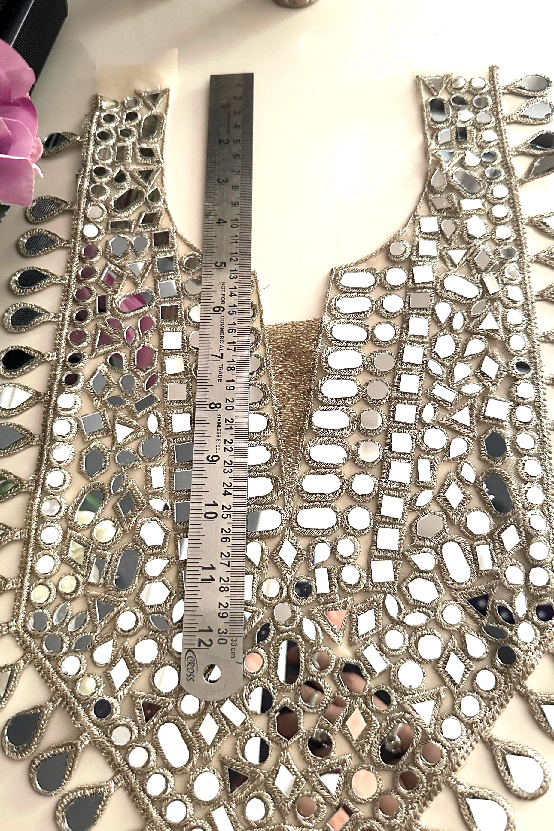Bring elegance and sparkle to your outfit with this handmade mirror work applique neckline patch. Perfectly designed with intricate embroidery and mirror embellishments, this V-shaped yoke is ideal for enhancing kurtis, blouses, saree blouses, lehengas, gowns, and DIY dress projects.