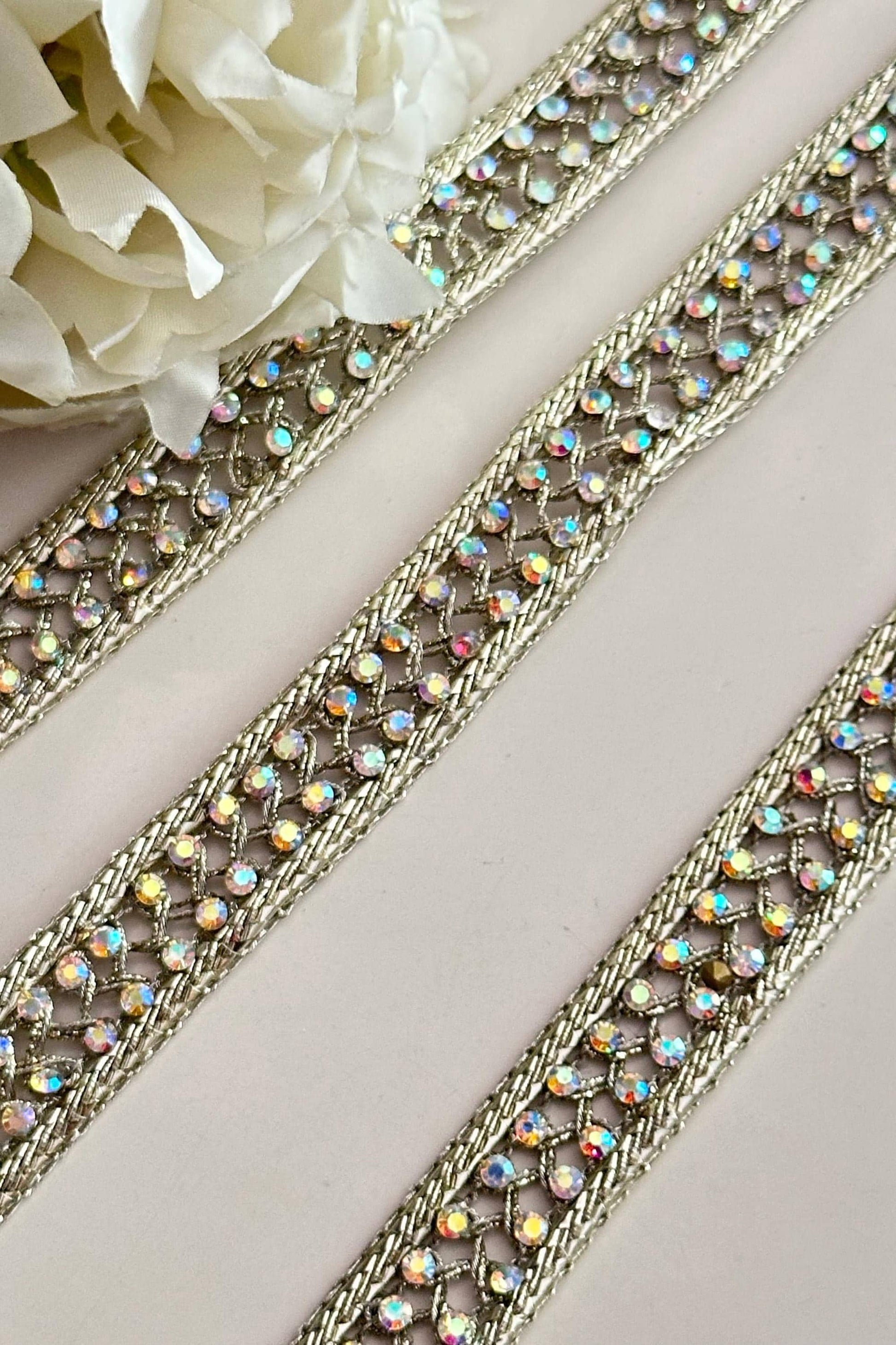 Infuse your projects with sparkle and celebration using Rainbow Radiance, a dazzling zircon stone lace trim embroidered with light gold zari threads. This festive ribbon combines vibrant rainbow hues with luxurious Indian craftsmanship—perfect for elevating holiday outfits, DIY gifts, and seasonal décor.