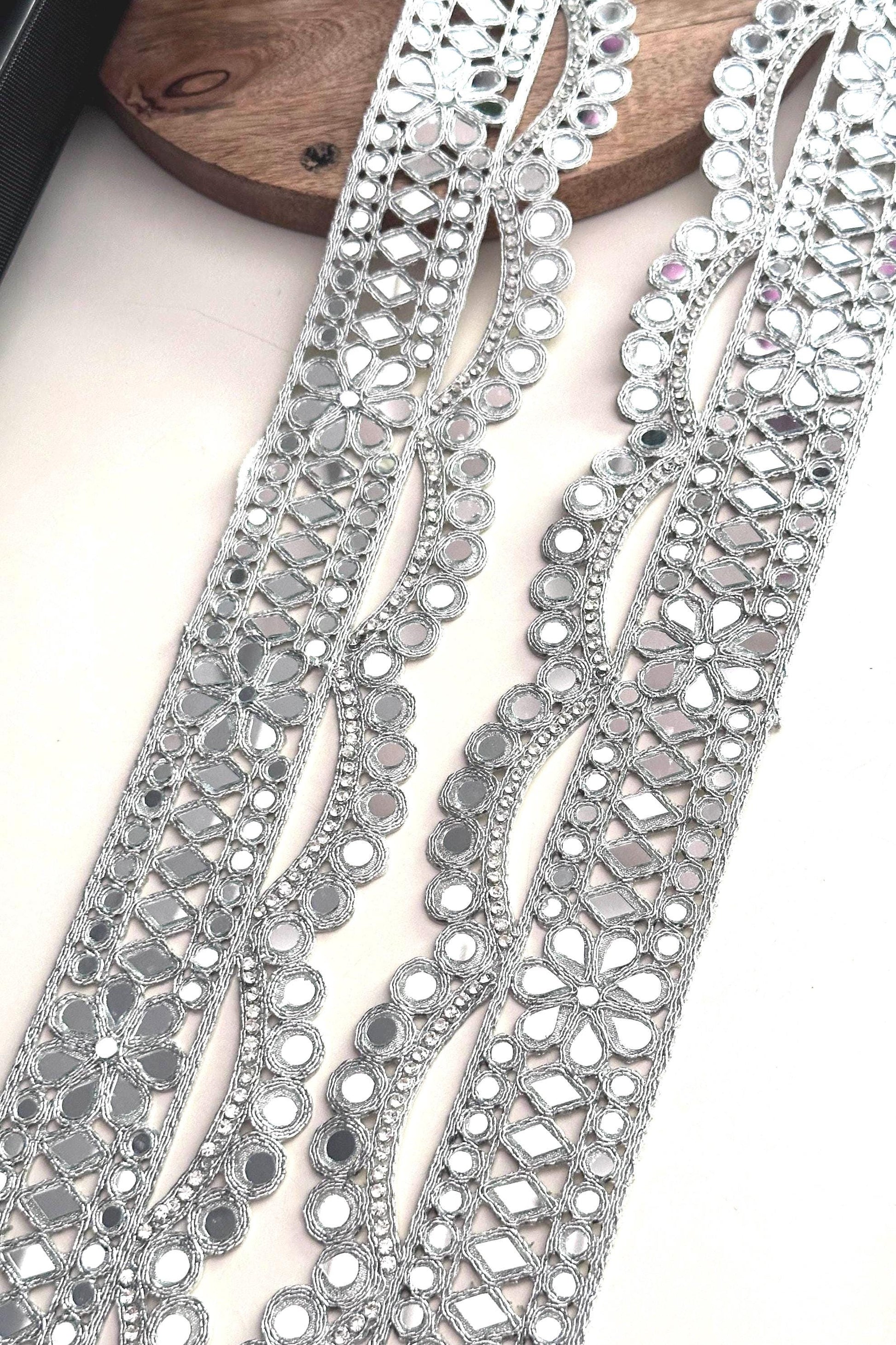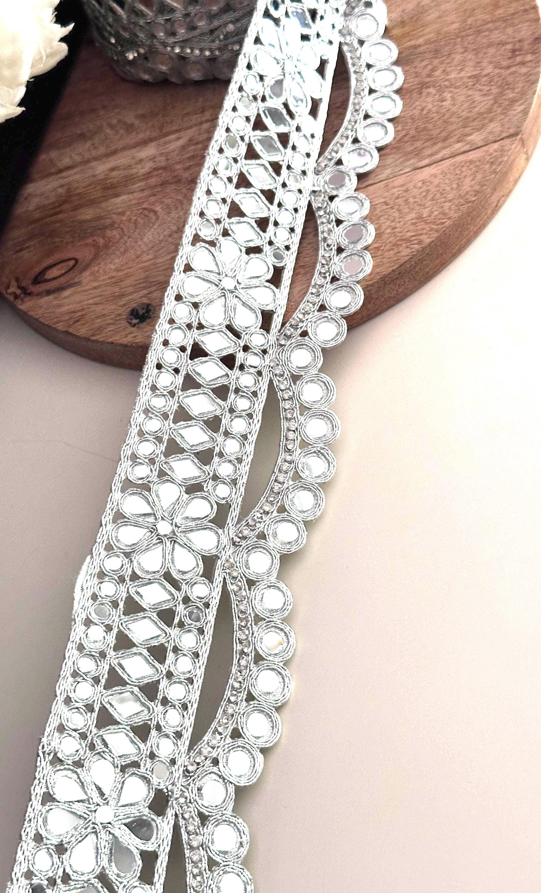 Add a dazzling touch to your designs with this handcrafted silver mirror lace trim, featuring petal-shaped floral motifs, real mirror embellishments, and a shimmering embroidered base.