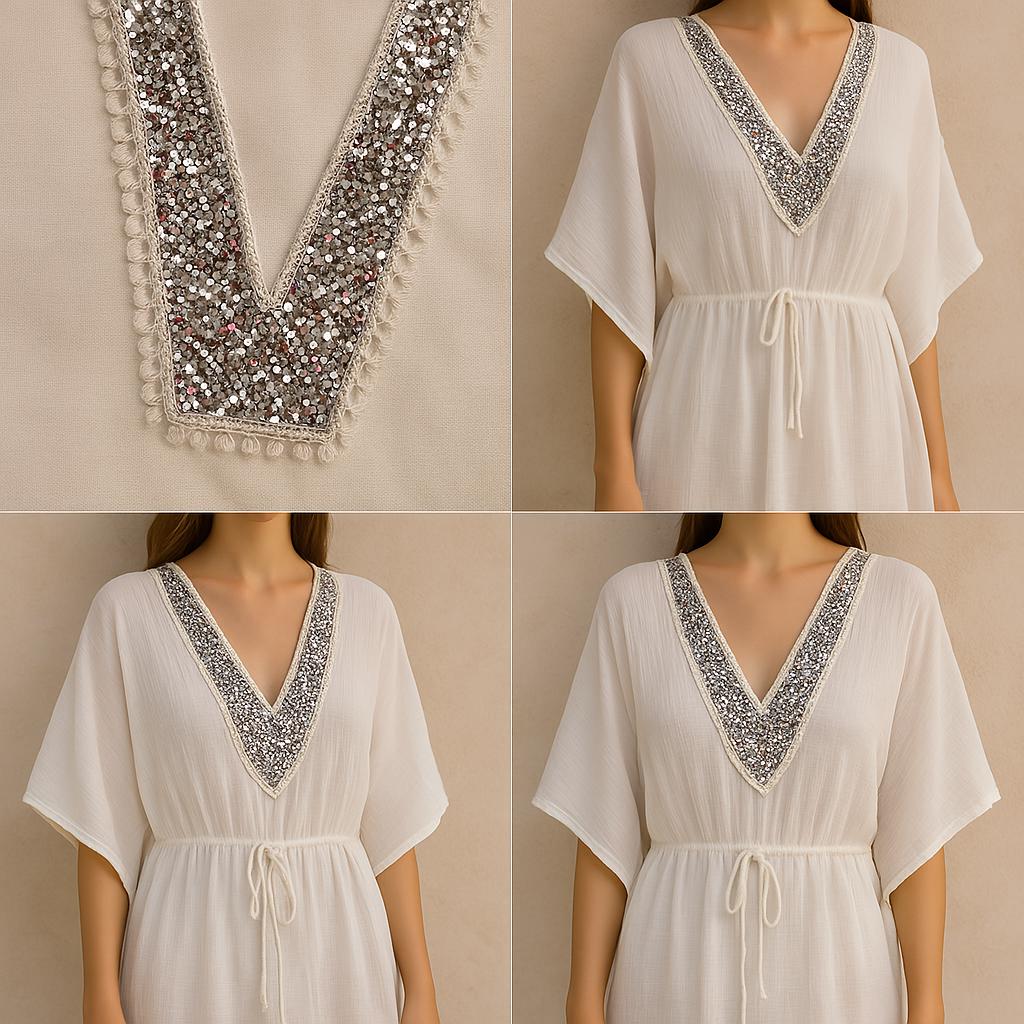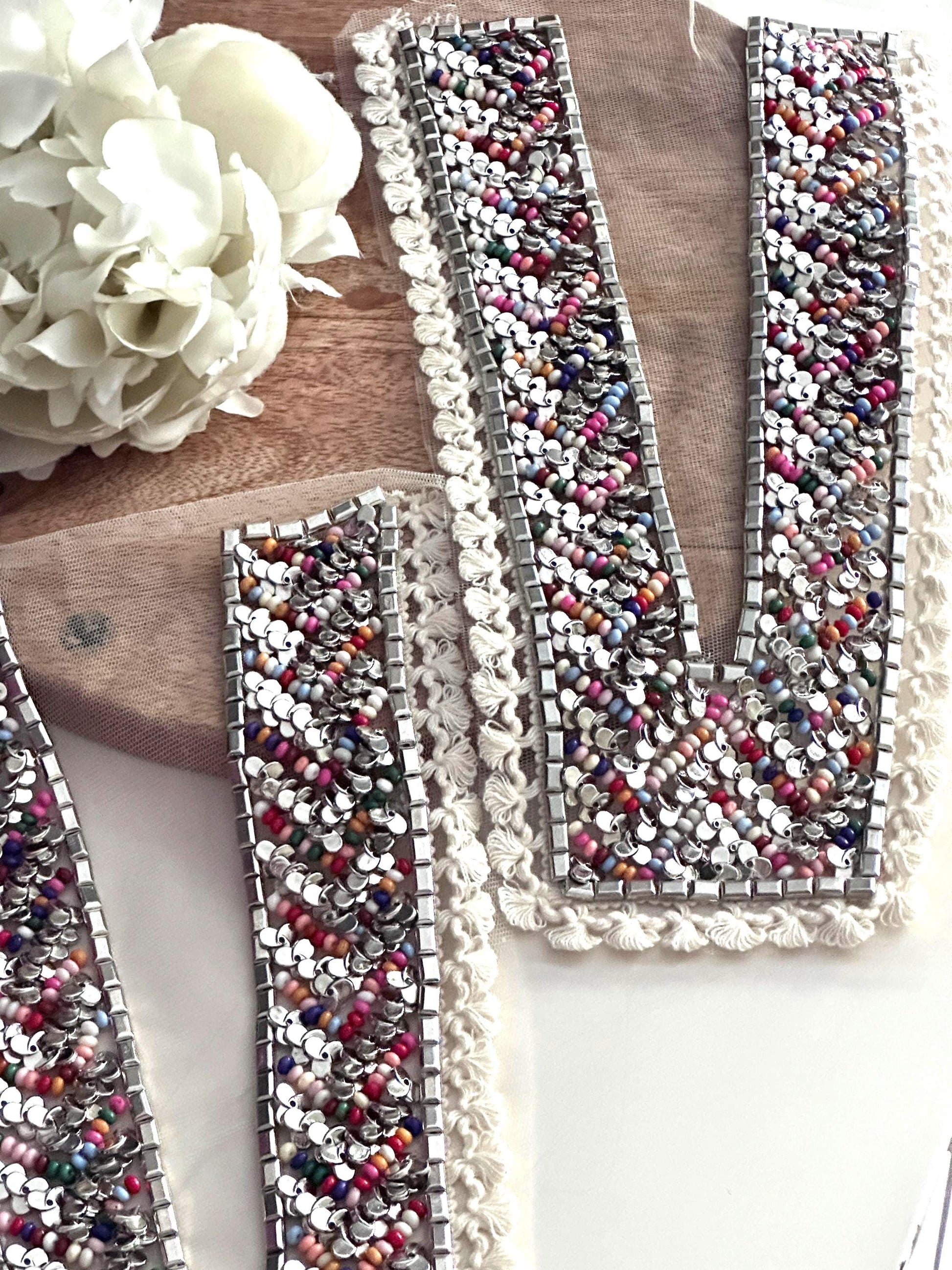 Add effortless elegance to your creations with this silver sequin and multicolor beaded V-neck applique patch. Hand-embroidered on soft mesh, this stunning embellishment brings shimmer, color, and movement to any outfit — perfect for beach cover-ups, kaftans, evening gowns, or resort wear.